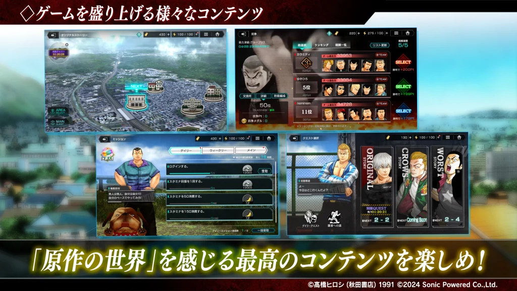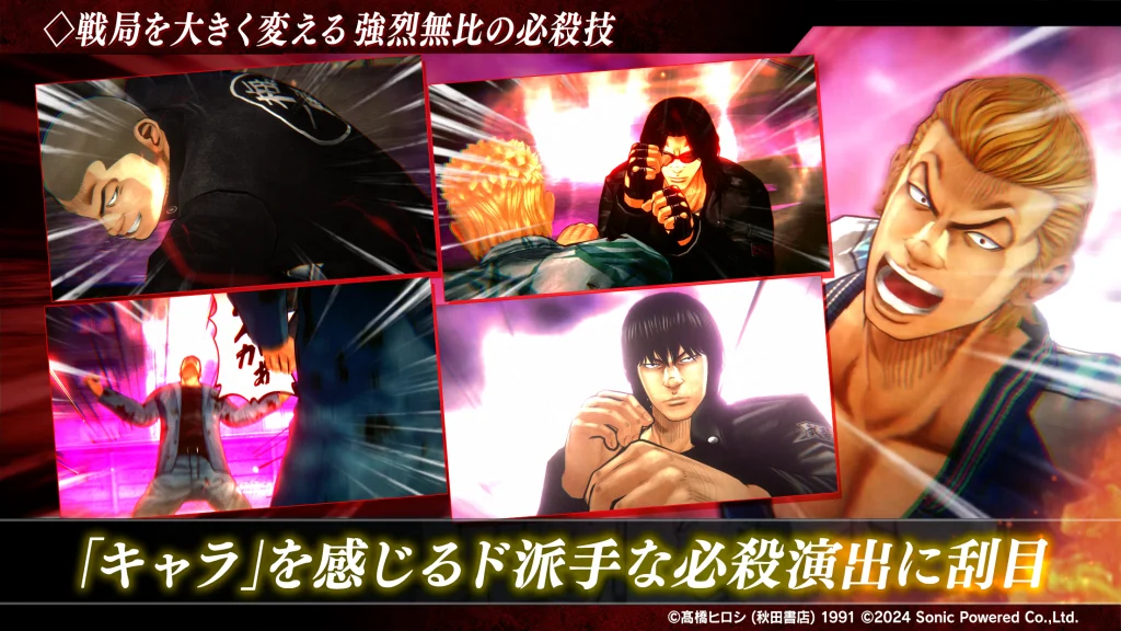 原作者・高橋ヒロシ先生の描く力強いキャラクターたちが、最高峰の3Dグラフィックスで再現されています。プレイヤーは自分だけのチームを編成し、戸亜留市(とあるし)の頂点を目指して喧嘩(バトル)に明け暮れることになります。物語は原作の追体験だけでなく、キャラクター同士のクロスオーバーも楽しめるため、全世代のファンが楽しめる内容となっています。